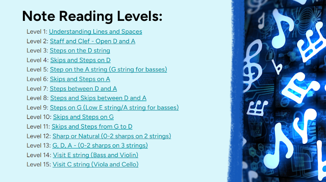 You might wonder how I can fill an entire concert with beginning orchestra students. My teaching has changed over the years. I used to teach note reading and playing skills simultaneously. I now hold off with 'real' note reading until after the 1st concert. This gives me a lot of time to focus on building proper technique. I've found that my students learn notes much more quickly after they are comfortable and confident with basic playing skills. I see my students every school day for 45-50 minutes. Here's what my students are playing for their first concert this year...without any real note reading: